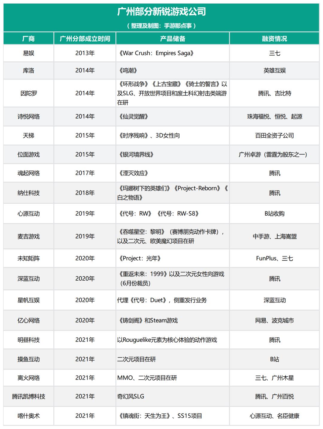 除此之外,广州还有位面游戏、纳仕科技、魂起等一批平地起高楼的新锐游戏公司,旗下在研的游戏品类涵盖了二次元、SLG、肉鸽、MMO、ARPG等品类游戏,不少厂商拿下了大厂投资。