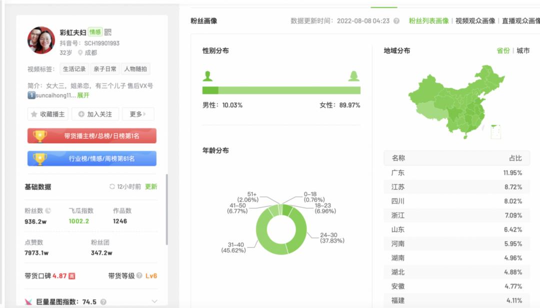 剁主发现,彩虹夫妇的大部分粉丝都是小镇宝妈。飞瓜数据显示,彩虹夫妇90%的粉丝都是女性,24-50岁的粉丝数占比92%,粉丝画像省份偏三四线城市。