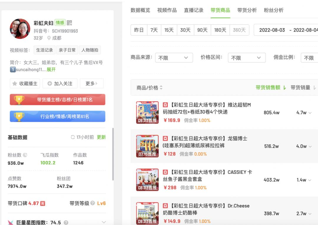 飞瓜数据显示,生日直播当天,销售额前三名是805.4万的维达抽纸、516.2万的龙猫博士纸尿裤和403.2万的卡丝鱼子酱黑金套盒。其中,维达和卡丝的佣金都为1%,意味着彩虹夫妇能拿到12万。而直播间中销售额接近300万的龙猫博士纸尿裤,佣金为0,则意味着彩虹夫妇有可能免费帮助龙猫博士卖了近300万的货。