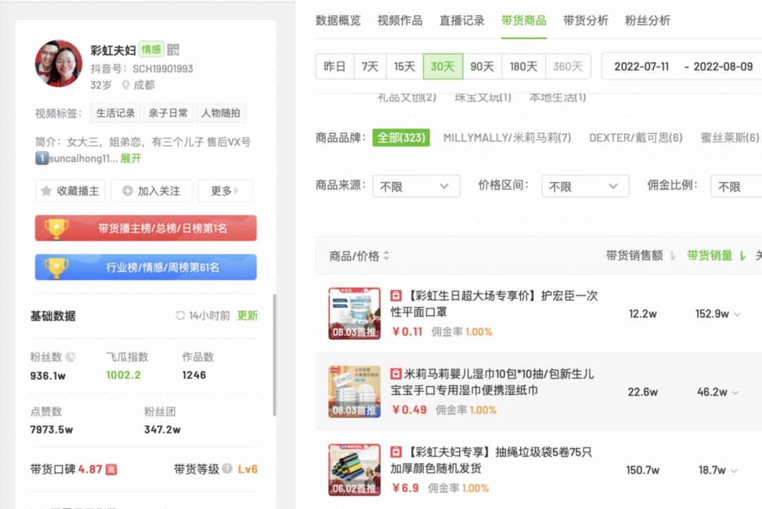 第二件事则是精准的选品策略。在选品上,从个护家清、家居用品,母婴宠物等,都是宝妈日常所需,且极具性价比,大多数都在百元以内,比如美妆没有选国际大牌,而是选择国货平价品牌欧诗漫,精准狙击小镇宝妈的钱包。飞瓜数据显示,彩虹夫妇直播间带货销量最高的前三名是152.9W的口罩、46.2W的湿纸巾和18.7W的垃圾袋。