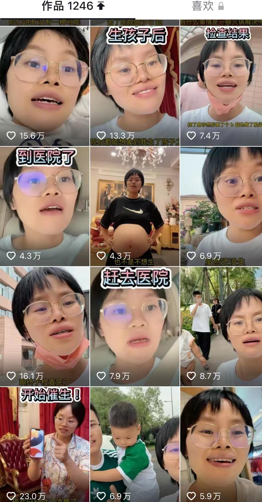 她会事无巨细地分享自己的日常,有自己带着小姑子、表弟组团队一起干直播的片段,有生二胎、怀三胎的片段,比如,今年彩虹怀了第三胎,从发现意外怀孕、到检查再到纠结要不要留下,全部拍成短视频,点赞量都过万。
