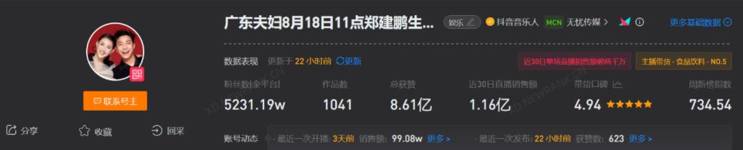比起彩虹夫妇,抖音头部CP主播广东夫妇更早登上头部主播的位置,当时凭借从背着麻袋的“打工夫妇”摇身一变“收租夫妇”的爽剧套路和反差人设吸引粉丝,相关视频点赞量都维持在10万以上,随即在巨大的流量红利下带货变现。但从近30天的数据来看,900多万粉丝的彩虹夫妇销售额已达3亿,而5000多万粉丝的广东夫妇销售额仅有1.3个亿。