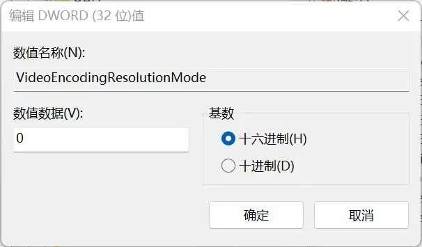 VideoEncodingResolutionMode双击打开,将值改为 0;