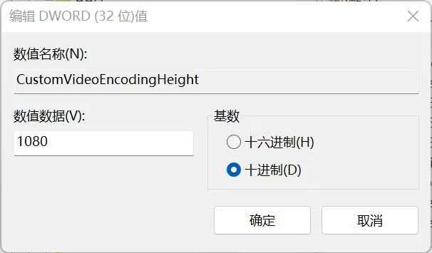 将CustomVideoEncodingHeight改为想要的视频高度,点击 “十进制” 然后输入 1080(建议)。