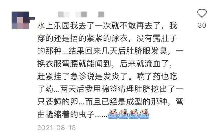 但感染还只是水上乐园“额外馈赠”里的普通版本,流血发炎,肚脐清理出虫,这不是恐怖片里才会有的情节吗?