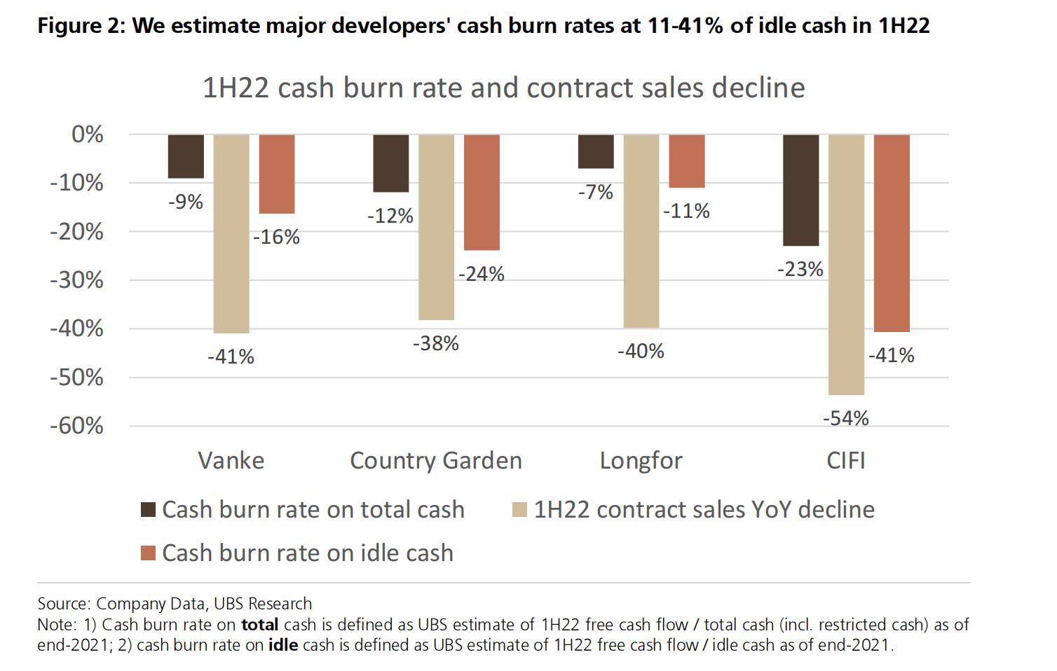瑞银分析师发表中国房地产行业研究报告,根据2021年底的闲置现金及2022年上半年的现金流出情况,来衡量4家内地房企碧桂园、万科、龙湖和旭辉的现金消耗率,并对需要多少合同销售量能够使其现金流达到收支平衡进行评估。报告认为,这四家主要内地房企均在2022年上半年产生了负的自由现金流,由于市场对现金流损耗的担忧,预期相关物管股的估值有下调压力。其中,龙湖评级下调至“中性”,目标价下调及25.7元。