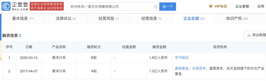 在逐梦娱乐圈这条路上,乐华娱乐并不是字节跳动唯一投资的娱乐经纪公司。企查查数据显示,2020年3月,字节跳动以1.8亿元独家投资了泰洋川禾的B轮融资。