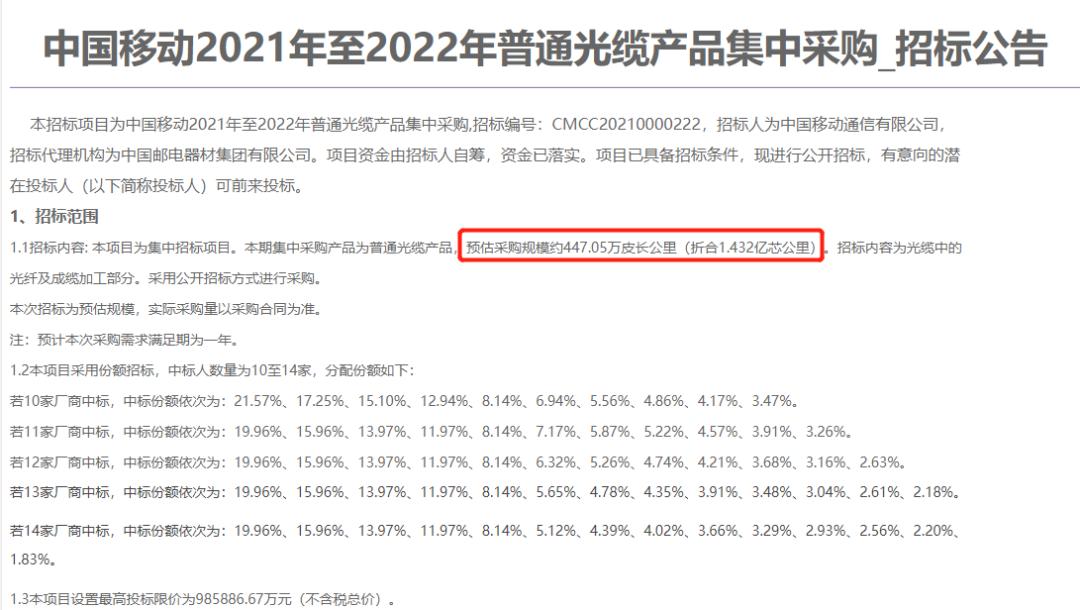 在中国移动于2021年10月完成的针对普通光缆产品的集采中,其宣布的需求规模约为1.43亿芯公里,较2020年的1.192 亿芯公里提升约20%。供需结构的改善以及原材料价格的上升,使得该次集采确立的光缆平均单价超过60元/芯公里,达到64元/芯公里,相比2020年价格水平提升了50%。