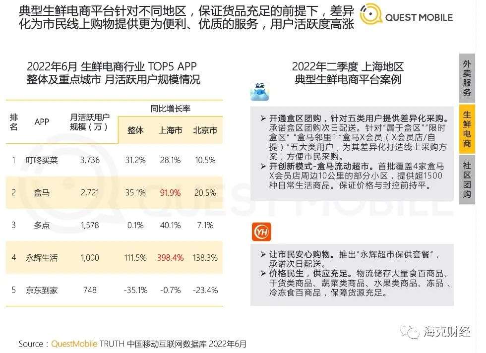 据QuestMobile数据,截至2022年6月,叮咚买菜、盒马、多点、永辉超市、京东到家依次以月活跃用户(MAU)3736万、2721万、1578万、1000万、748万,位列国内生鲜电商行业APP前五位。需要注意的是,叮咚买菜MAU超出盒马1015万,且其整体同比增速与盒马相差不多,前者为31.2%,后者为35.1%。
