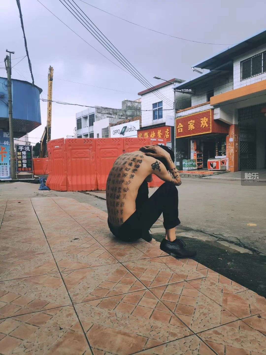 至少现在,罗福兴很适合“九纹龙”史进。他瘦削,身上的文身不比史进少:锁骨附近是从右到左的名字缩写“LFX”和“兴主流”;肩膀上有“俺罗福兴”和“天上人间唯我独尊”;两个手肘那里刻着蜘蛛网,象征被工厂困住的自己;小臂上是“色即是空,空即是色”和一些花纹;背后是一大段反经……都是他在当杀马特期间文的。
