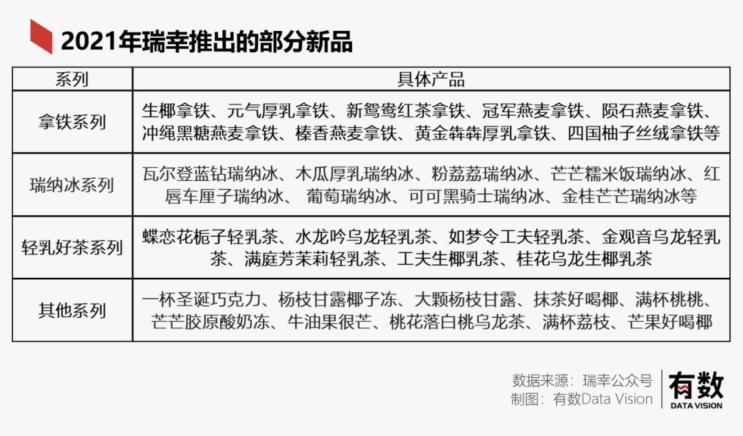 2021年全年,瑞幸共推出了113款全新现制饮品,隔壁奈雪的茶2021年共推出41款,瑞幸出新款的速度是其三倍。