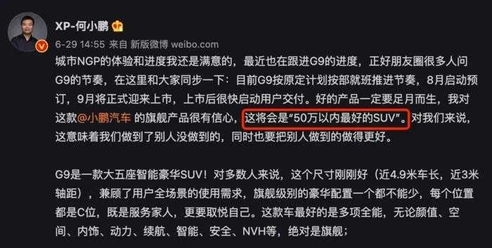 新势力们自己也清楚,何小鹏后来又在微博说道:“小鹏G9的底盘操控可以媲美保时捷卡宴,整车NVH可以媲美迈巴赫”,悄悄加入了对比项。我们看破了还得说破,突出内饰、底盘、屏幕等某一功能或参数的优势,针对用户的特定需求进行高密度宣传,是新势力惯用的营销手法。