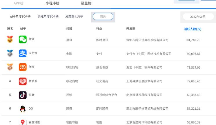 2022年5月APP月活跃人数榜单,来源:易观千帆