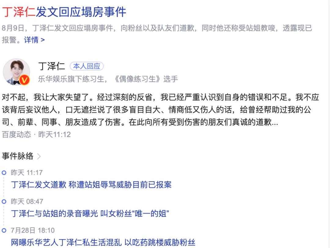 近日,乐华旗下艺人丁泽仁也被爆料偶像失格,站姐用三百万的真金白银去捧这位前途不明的“爱豆”,这位“爱豆”却跟粉丝偷偷恋爱又出轨、内涵拉踩同公司队友、用跳楼割腕等自杀手段威胁站姐,最后还倒打一耙,让站姐落下“精神控制”的罪名。