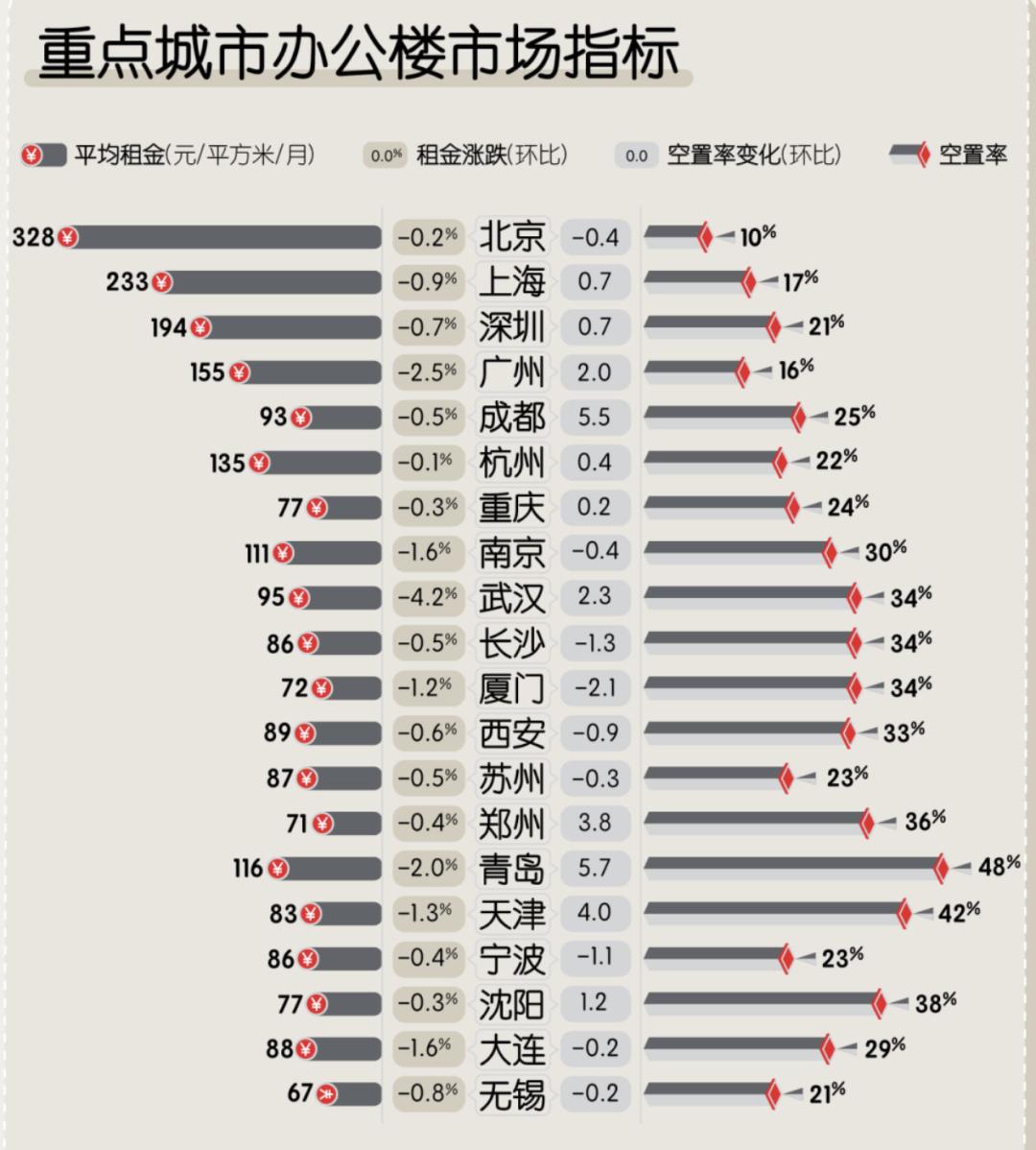 揭晓了全国各大城市甲级写字楼的存量、租金、空置率等情况。