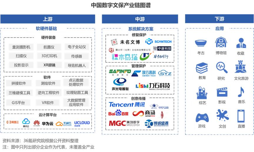 产业链上游为软硬件供应商和云计算服务供应商。硬件供应商主要提供量测摄影机、航摄仪、全站仪、三维扫描仪、3D打印机、投影显示设备、传感器等产品。软件供应商主要提供测绘软件、点云数据处理软件、GIS平台、三维建模工具、逆向工程软件、大数据管理应用软件等工具。当前,我国在测量测绘、三维建模、文物修复等文保领域的软硬件技术水平与国际一流水平尚存在一定差距,产品的产量、品种、稳定性、精度等方面需要持续迭代提升。