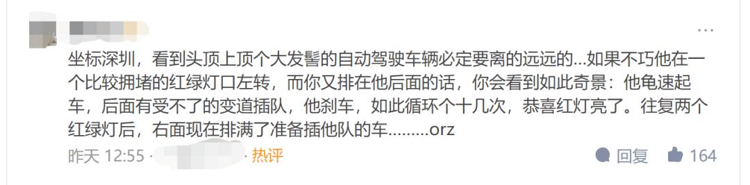 有网友也补充到,这样的情况在深圳也是见怪不怪了。如果在一个拥堵的红绿灯口排在自动驾驶出租车后面,他会保持龟速行驶,这时会有一些车辆变道插队,然后被刹车叫停,如此循环,右边会排满准备插队的车。