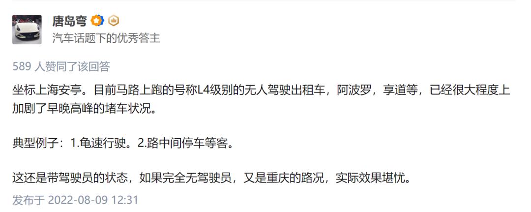 比如有网友就表示,在上海安亭的无人驾驶出租车在带驾驶员的情况下,还是会出现“龟速行驶”和在“路中间停车等客”的情况,实际效果实在是堪忧。