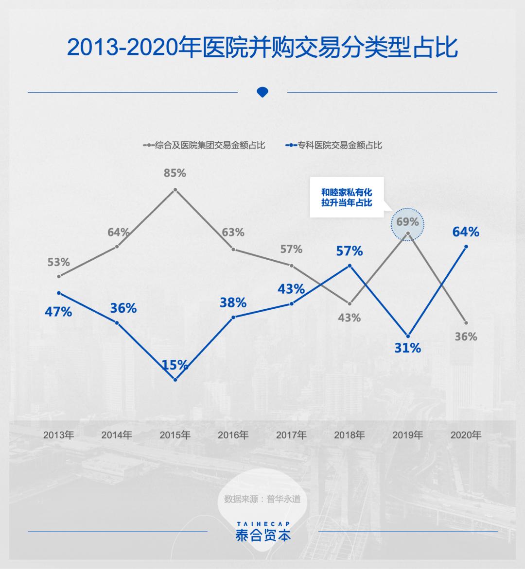 从2018年开始,具备专科特色优势及优质医师资源的专科医院逐步受到投资方的青睐,并购资金开始由综合医院集团向专科连锁医院倾斜,民营医院的并购整合开始成为主流。根据普华永道统计数据显示,2020年国内专科医院并购交易金额占医院总并购资金的六成以上。