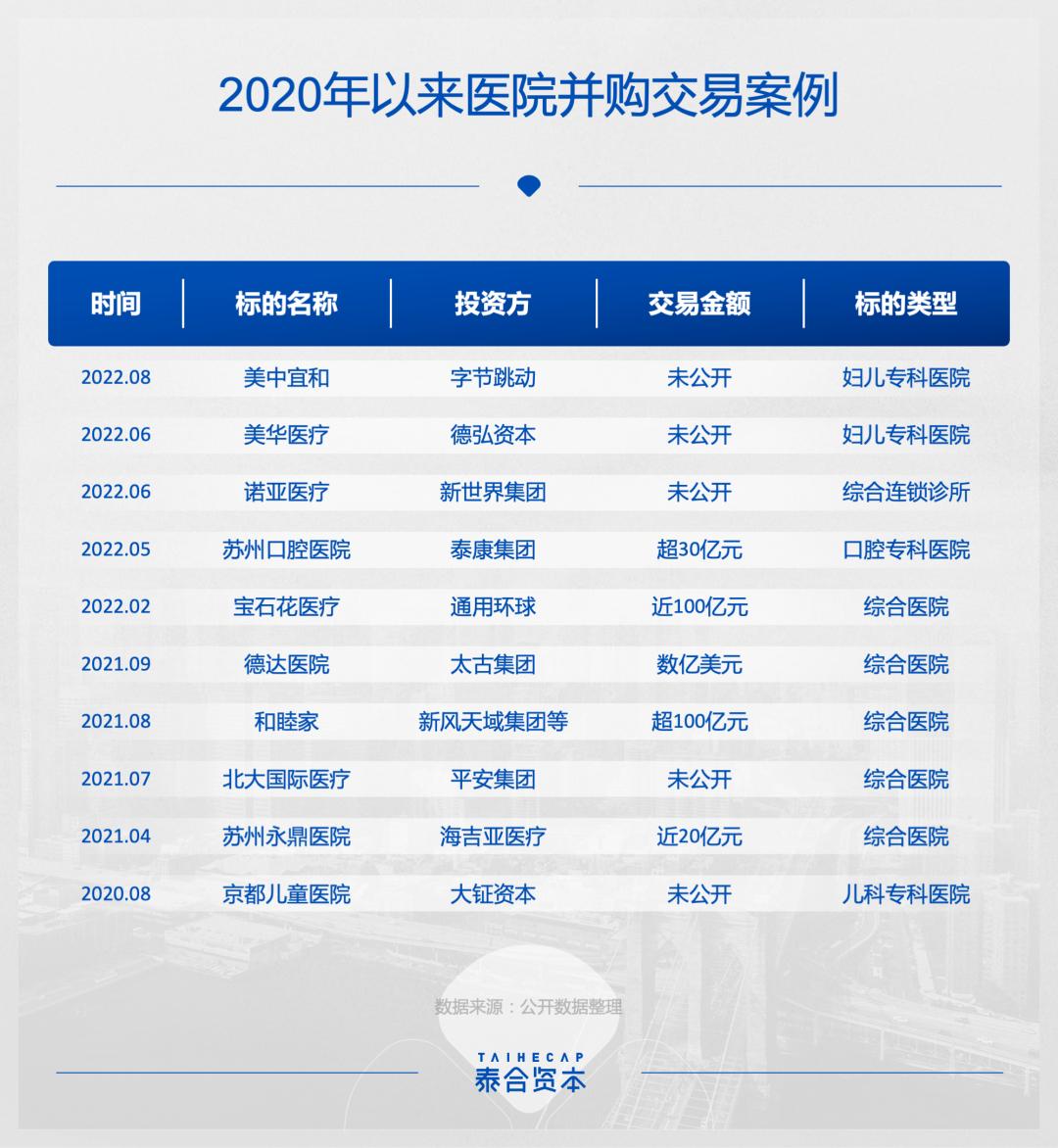 8月5日,互联网巨头字节跳动全资收购妇儿医院美中宜和的消息无疑将市场的目光引向了医院资产。事实上,医院领域的并购交易在过去几年中非常活跃:上市公司海吉亚豪掷近20亿收购苏州永鼎医院、PE并购基金德弘资本收购上海美华妇儿医院、险资巨头平安保险接管北大国际医院、泰康保险38亿元收购苏州口腔医院等等……