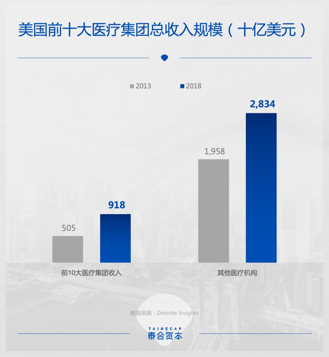 并购热潮中,强者愈强。在此期间,美国前十大医疗集团市场占有率和收入规模大幅增长。2013年至2018年间,美国前十大医疗集团的市场占有率提高至24%,合计收入增长率是其他医疗机构总收入增长率的近两倍。