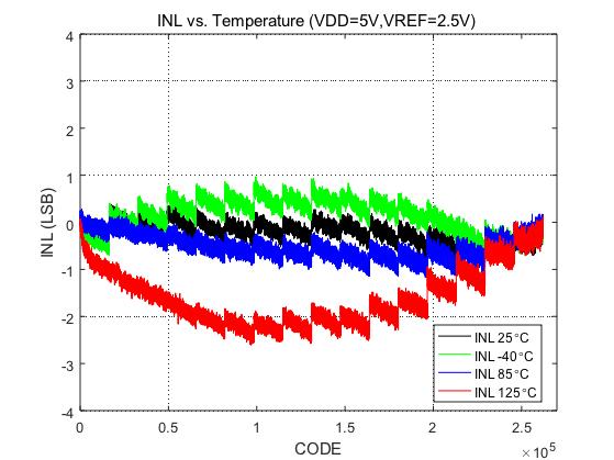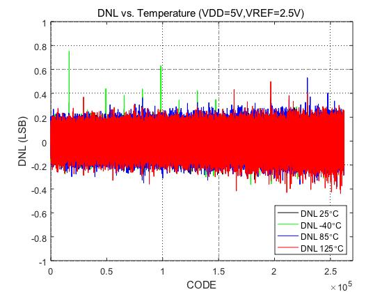 在工业温度范围(-40 ⁰C到85 ⁰C)内,该系列产品在18位时的差分非线性度(DNL)优于± 1 LSB (室温下为± 0.75 LSB),积分非线性度(INL)优于 ± 2 LSB(室温下为± 1 LSB)。这些优异的特性可以保证诸如半导体测试设备等精密测控系统的线性度,简化系统设计。