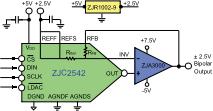 ZJC2541-18、ZJC2542-18均采用标准的串行接口,可以支持2.7 V至5.5 V供电。ZJC2541-18为SOIC-8封装,提供单端电压输出0~VREF;ZJC2542-18为SOIC-14封装,它在ZJC2541-18的基础上自带高精度反馈电阻网络(电阻匹配精度为±15 ppm,全温范围内优于±60 ppm),与治精微已量产的36 V供电精密运放ZJA3000(常温输入失调电压优于40 µV, 温漂优于0.7 µV/⁰C)或者即将量产的36 V供电精密运放ZJA3001(常温输入失调电压优于40 µV, 温漂优于0.7 µV/⁰C,图三中其供电电压可以变为±5 V)和5 V低功耗精密基准电压源ZJR1002-9 (输出2.5 V,常温初始误差优于500 ppm, 温漂优于5 ppm/⁰C) 一起配合使用,可以提供 ±2.5 V的双极性输出。它们的少引脚数令其使用变得非常简单,与控制器的连接也非常简洁。