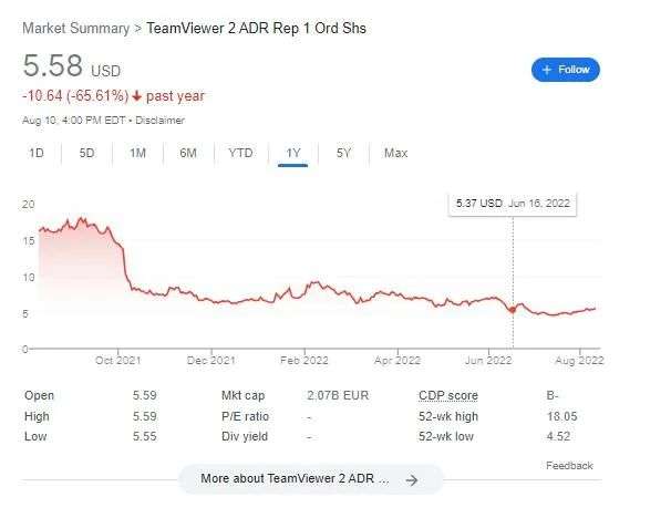 这份赞助似乎从一开始就不被投资者看好。2021年3月,赞助消息公布后,TeamViewer股价马上暴跌12%。而目前股价相对于赞助前,更是下挫接近八成,从25.55美元跌至8月10日的5.58美元。