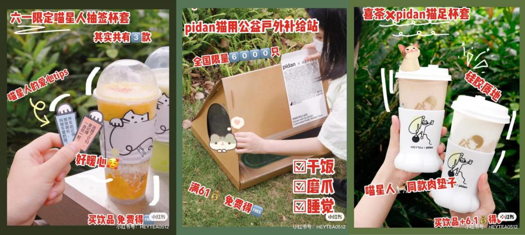 今年6月,喜茶与宠物品牌pidan首次跨界合作,限量推出6000个公益猫窝,呼吁关注流浪动物,给猫猫搭一个家。同时,在六一儿童节节点,推出「喵星人爱心帖示 六一联名杯套」、「六一限定喜茶✖️pidan猫足杯套」、「pidan猫用公益户外补给站 喜茶联名款」。可爱杯套吸引消费者尝新收集的同时,也吸引了不少铲屎官在评论区分享自家毛孩子的照片,以及在各个平台晒图。