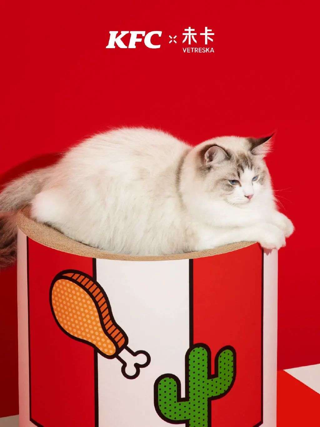 时间再往前推,7月肯德基还和国内新锐宠物生活方式品牌「未卡VETRESKA」推出了联名限定款「肯德基×未卡猫抓桶」。融合了肯德基全家桶经典的红白造型和未卡标志性的仙人掌符号,旨在让宠主与爱宠共同分享肯德基的美食之乐,传递“生活好滋味,桶桶都给你”的美好愿景。