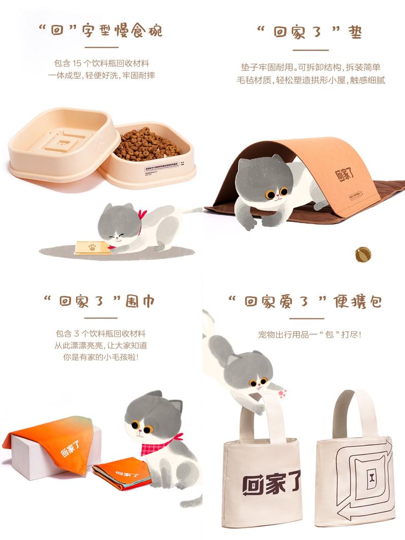 因此,在今年8月8日国际爱猫日,可口可乐中国与北京领养日共同发起rPET“回家了”计划,利用回收的饮料瓶打造了365套“回家了”套装,包含“回”字型慢食碗、垫子、宠物围巾、契约书门把手挂件和宠物用品便携包这些实用用品,用来答谢那些用实际行动支持“领养代替购买”的朋友们。