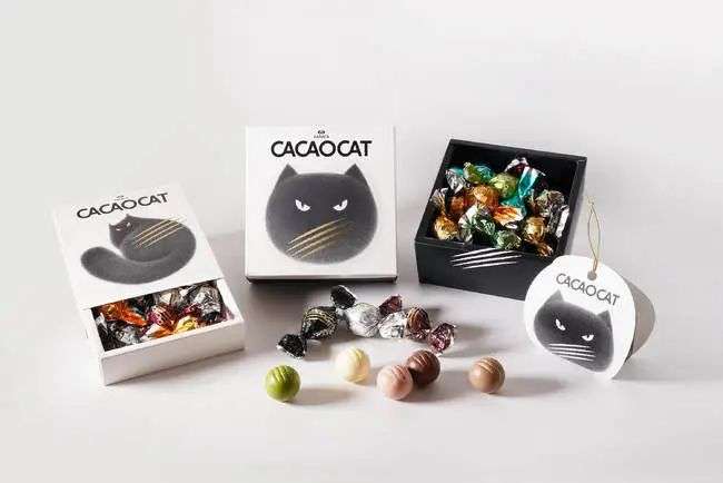 或者也可以选择和猫咪IP联名推出新包装。如巧克力品牌CACAOCAT就曾与马来西亚的动物创作艺术家Kamwei Fong合作,将CACAOCAT标志性的抓痕元素和Kamwei Fong创作的黑猫结合,制作了独特的包装。