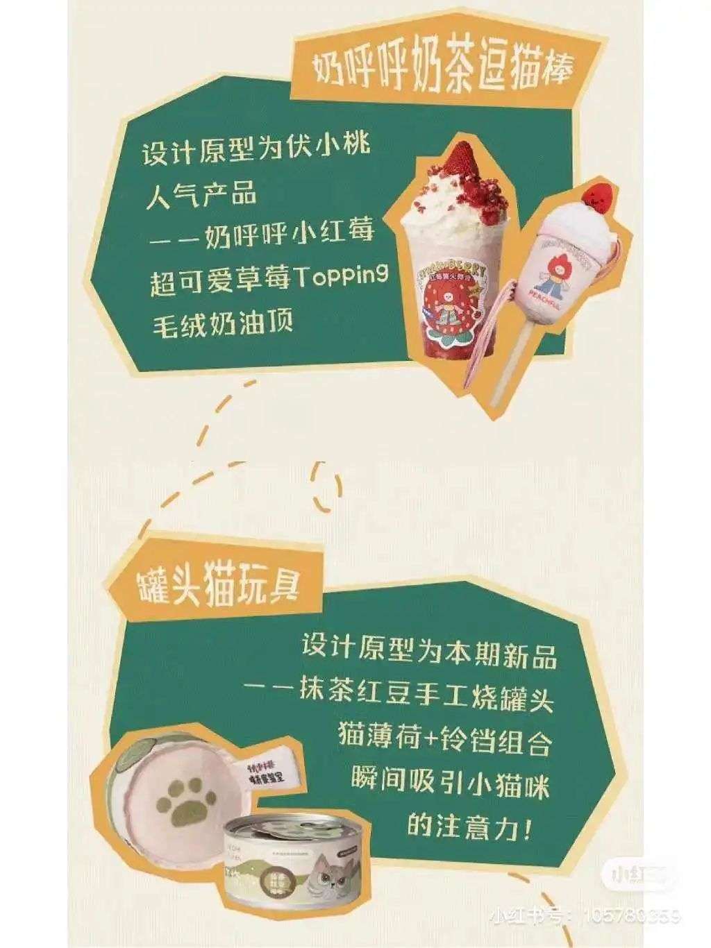 8月2日,新茶饮品牌伏小桃携手宠物品牌噗扑实验室,共同推出了以伏小桃的人气产品——奶呼呼小红莓奶茶为原型的逗猫棒,和以伏小桃新品甜品——抹茶红豆手工烧为原型的猫罐头玩具。