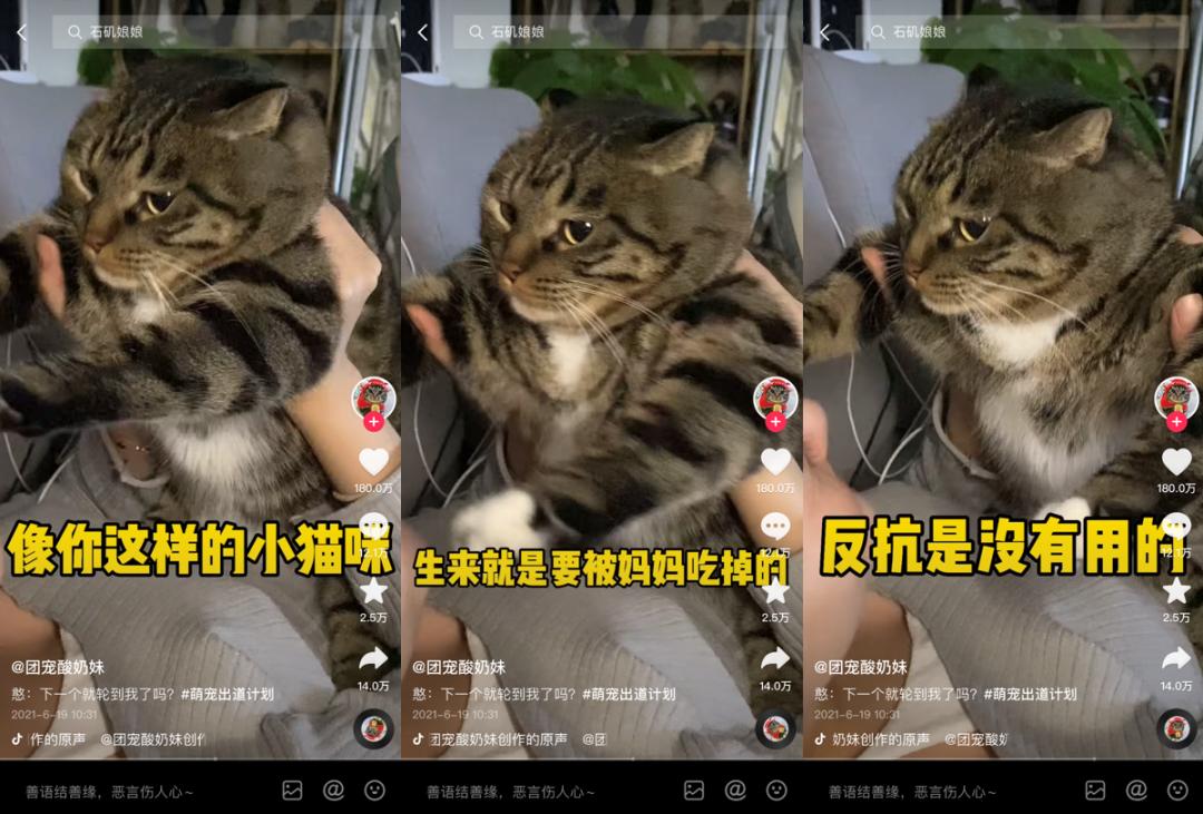 去年,萌宠博主@团宠酸奶妹因为一条“吃猫”视频爆红。视频中,博主发出酷似动画人物石矶娘娘的魔性张狂笑声,对自家小猫咪一通狂亲,虎狼之词,为所欲为,让人纷纷留言“ 小猫咪眼睛里已经没有光了。”“小猫咪需要法律援助吗?”“这位铲屎官需要吃点化毛膏吗?”,也让不少人看到了自己平时“吃猫式吸猫”的影子。