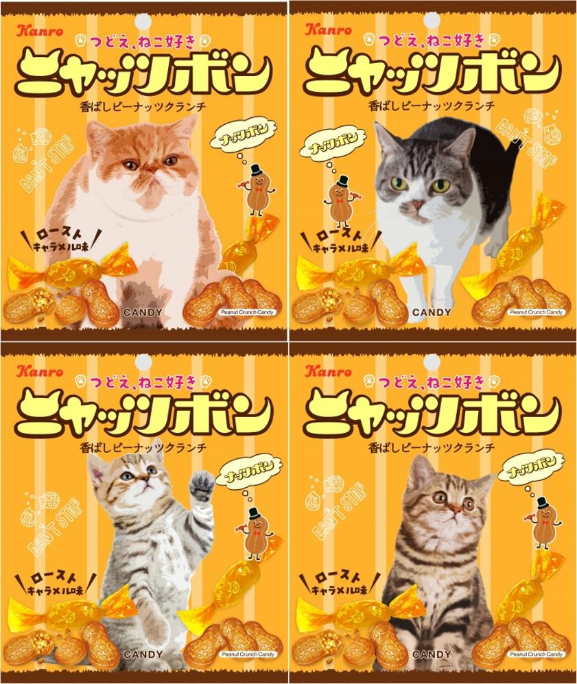 如日本的糖果品牌Kanro,就在2020年2月22日猫咪日节点,给自己的经典产品「ナッツボン」烤花生夹心糖换上了四款限定包装,四款包装上分别印着不同品种、不同姿态的猫咪,连糖纸上都隐藏着小心思,印着可爱的猫咪。