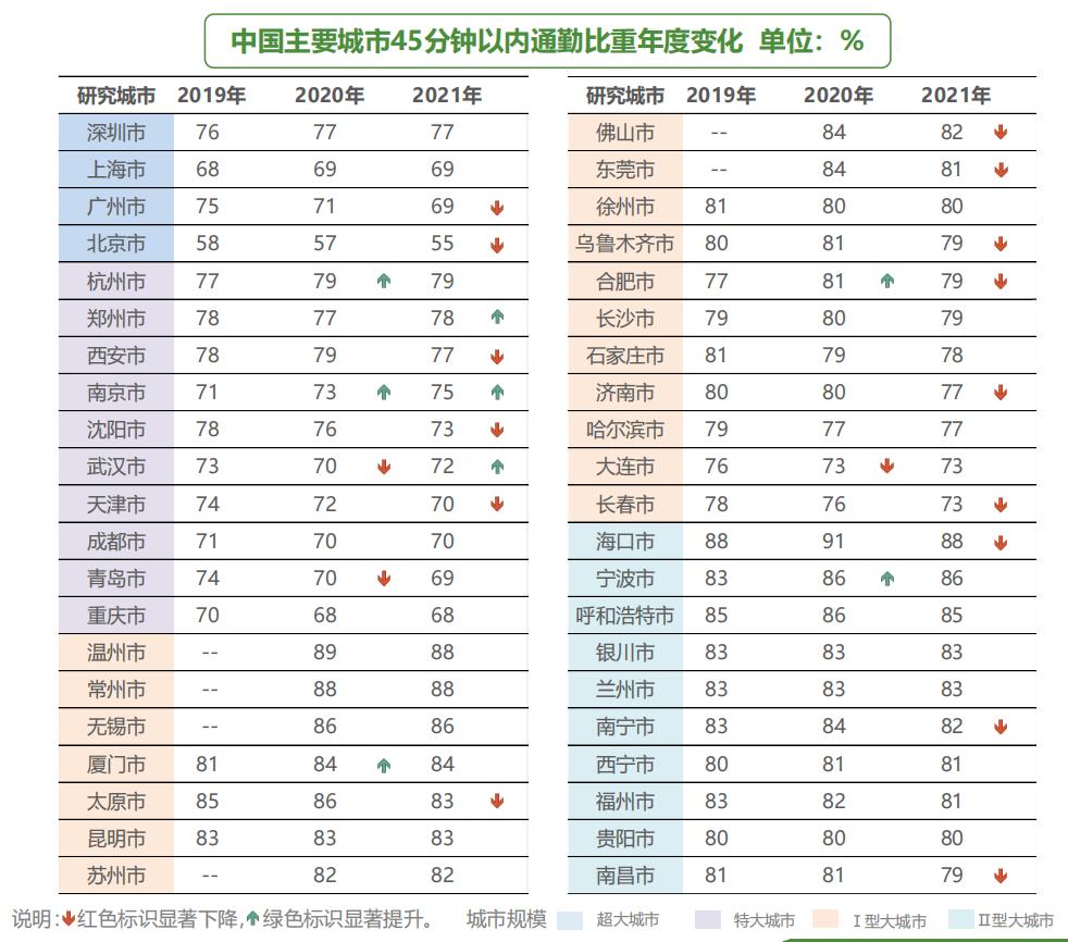 《报告》认为,提高“45分钟以内通勤比重”是改善城市人居环境的重要目标,是城市规划和交通服务水平的综合体现。