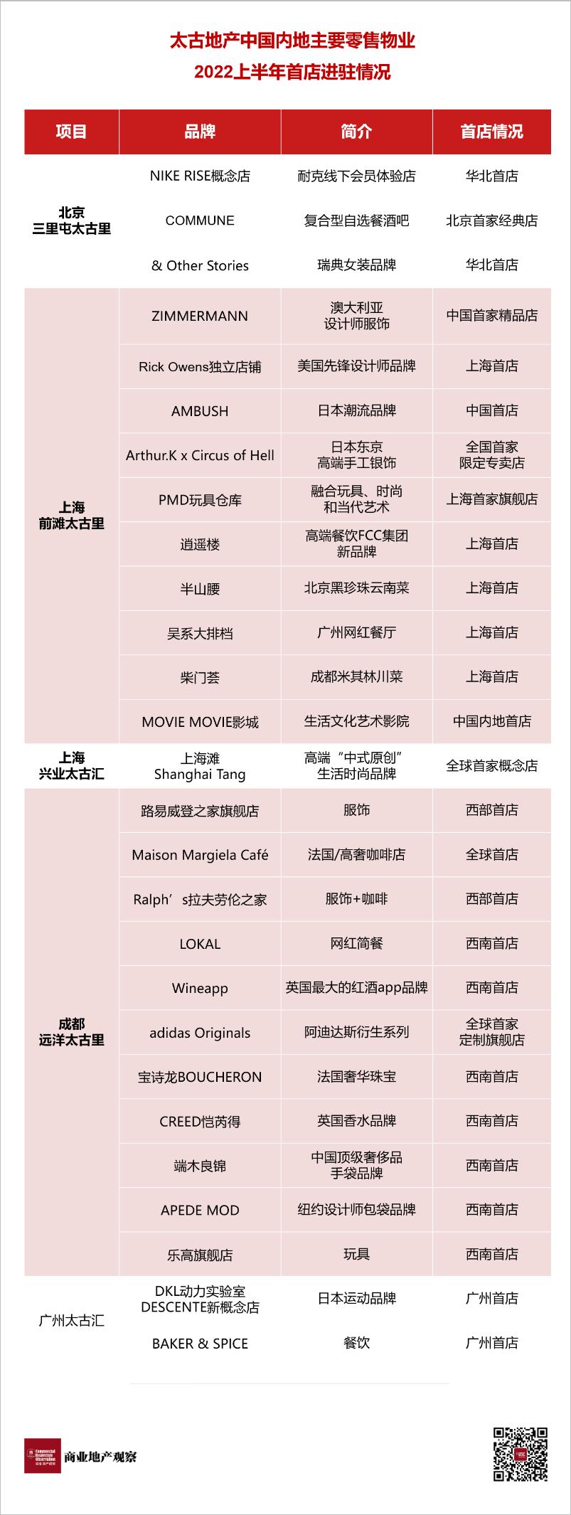 太古地产预期,未来奢侈品牌对广州及成都的零售门店仍有殷切需求;在上海,预计奢侈时装、化妆品及生活方式品牌、餐饮租户对商场的需求稳定,北京零售销售及零售楼面需求预期在2022年下半年稳步复苏。