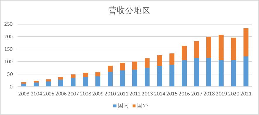 通过营收的地区分布可以看到,反倾销案的胜利致使福耀在过去二十年的海外销售占比越来越高,2003年海外占营收比为31.79%,而2021年年报海外收入贡献福耀总收入的比例已经达到了47.59%。