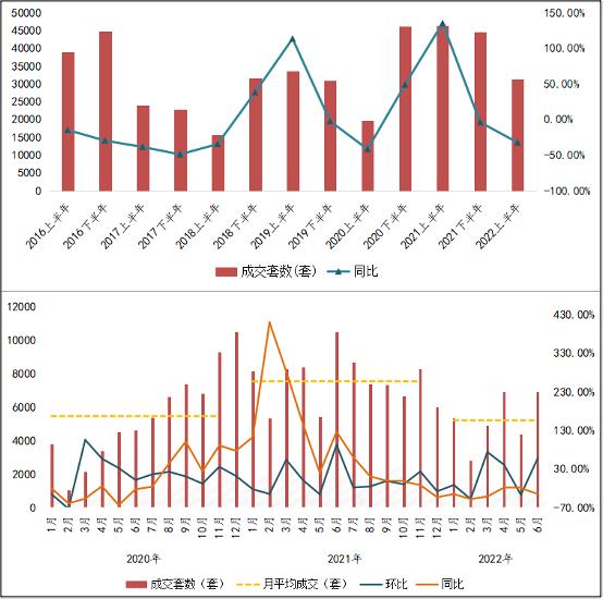 图:北京新房成交套数半年度及月度走势 数据来源:诸葛研究院
