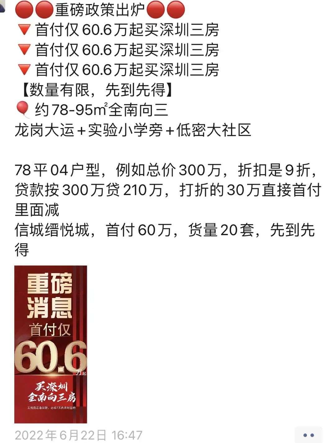 早些时候,该项目销售渠道还曾发出“首付60万,买深圳全南向三房”的宣传海报,并提示是工抵房着急回款,必须7天内准时签约。这也被市场质疑为是变相降低首付。