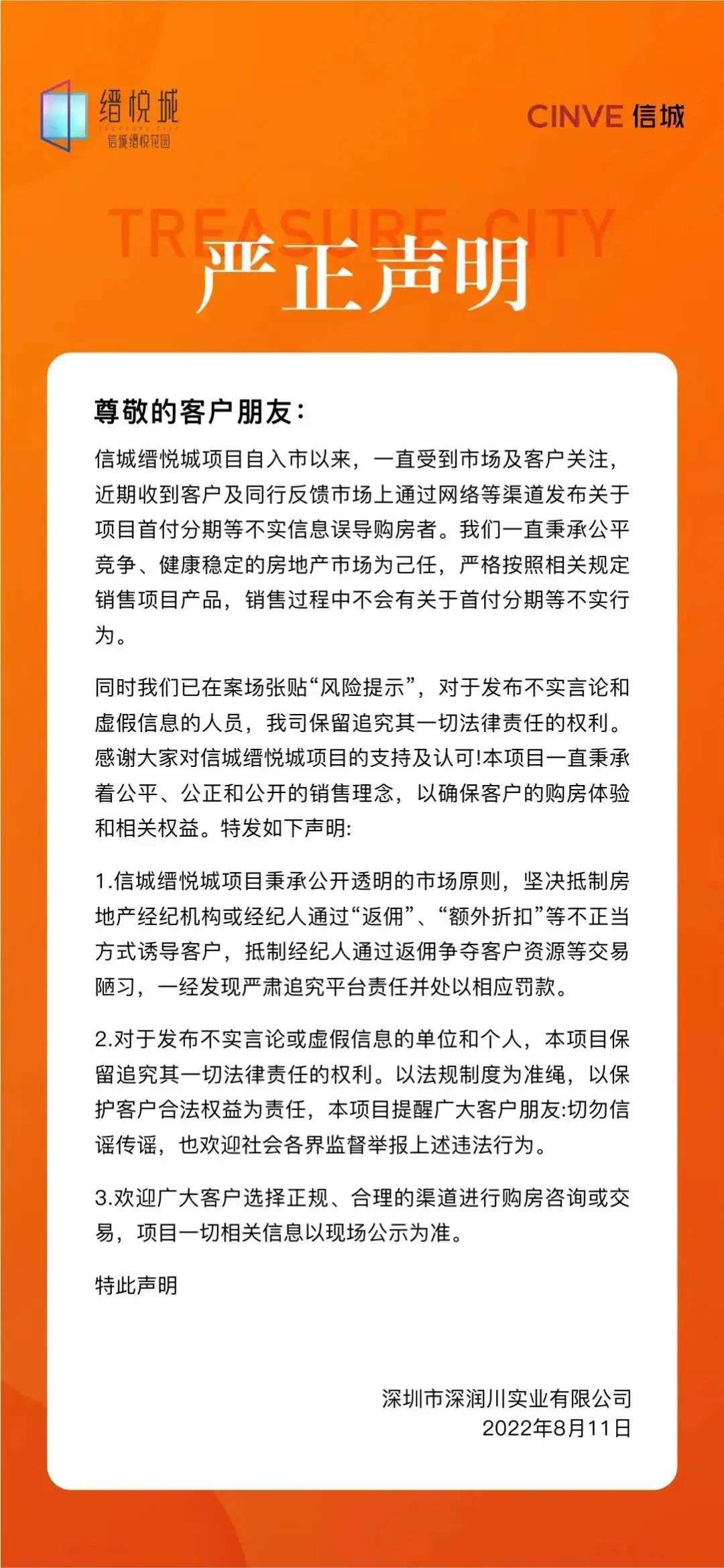 不过,就在中介朋友圈大肆刷屏的同时,信城缙悦城官微在今日下午发出了一份有关“项目首付分期不实信息的严正声明”。
