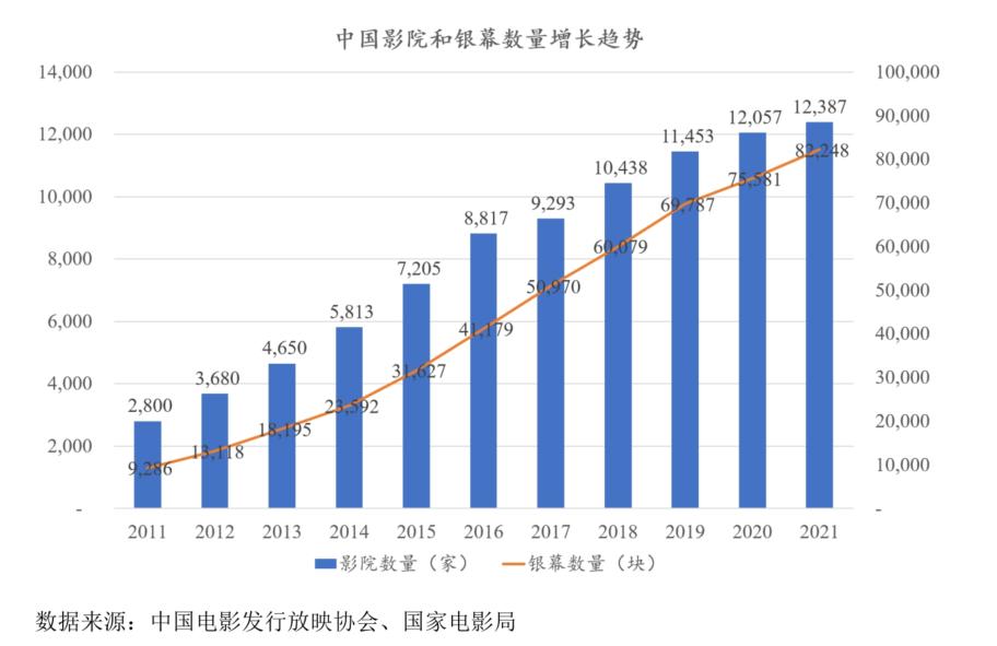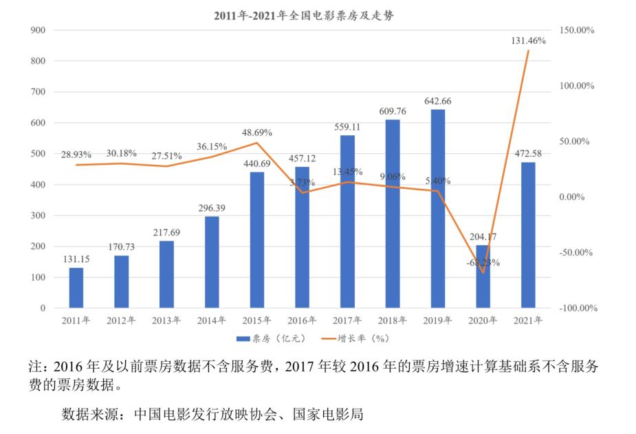 根据国家电影局统计数据,国内电影票房从 2011 年的 131.15 亿元增长到 2021 年的 472.58 亿元,年均复合增长率达到 13.68%,看起来还不错。