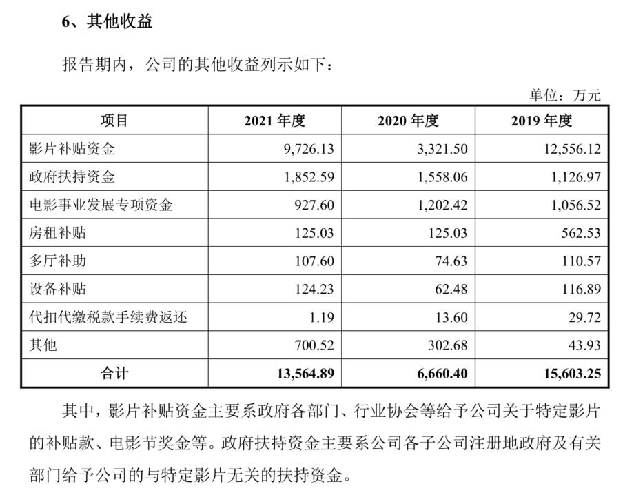2019 年 — 2021 年,博纳影业获得政府补助的金额分别达到 1.56 亿元、6647 万元和 1.36 亿元,占当年利润总额的 36%、30% 和 27% 。