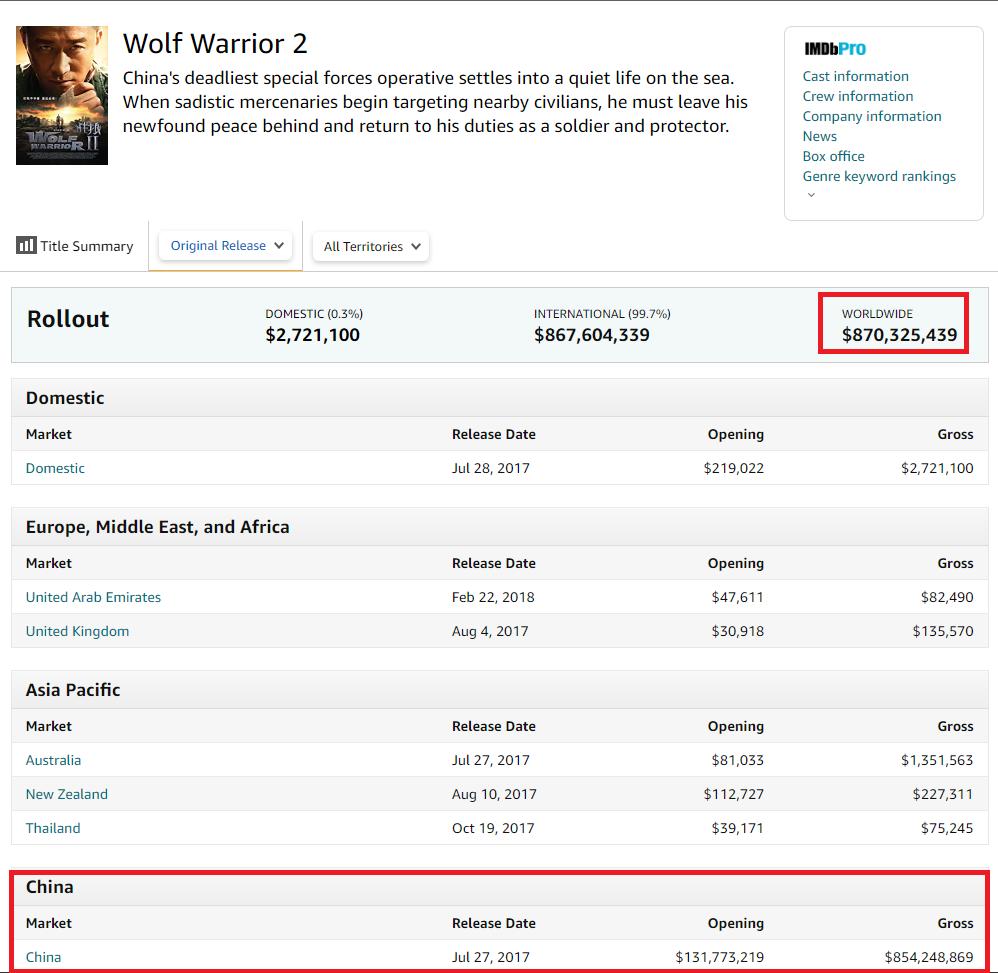 而《 战狼2 》的国内票房,也占全球总票房的 99% 以上。