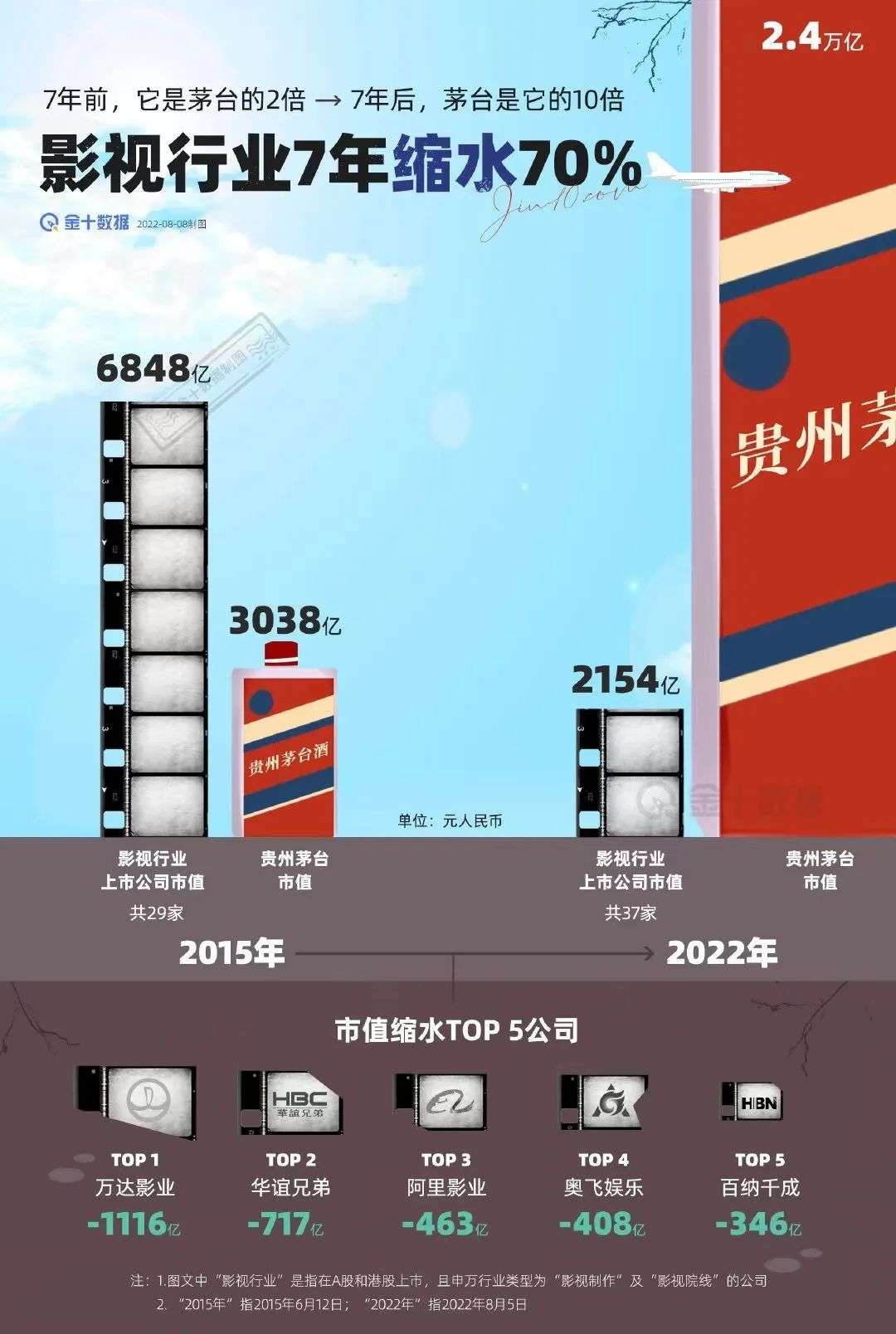 金十数据做过一项统计,2015 年 6 月,影视行业所有 29 家上市公司的市值加起来,是茅台的 1 倍多。7 年后的今天,影视板块的市值缩水 70%,茅台的市值是它的 10 倍。
