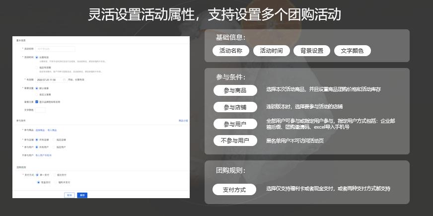 通过有赞企业团购解决方案,商家可以根据和企业间的团购协议,创建对应的团购活动:限定参与企业,设置商品的价格和库存以及活动时间,并且生成员工密钥或黑名单管理;员工可以在活动时间内随时购买或统一团采,支付方式支持单一福利卡支付或组合支付(企业+员工支付);在结算方面,通过独立清晰的财务报表,让双方企业线下按月度或者季度对公结算。