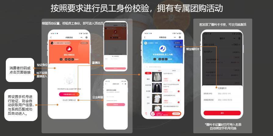 - 在员工身份验证上,支持验证码、邮箱和手机号三种验证方式,员工可以按照企业要求进行身份校验,参与团购活动;同时支持离职黑名单等模式;