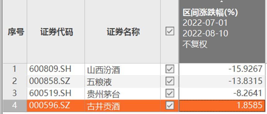 以东方港湾1号重仓的四个白酒股为例,7月1日至8月10日期间,仅有古井贡酒微涨1.86%,其余均大幅下跌。