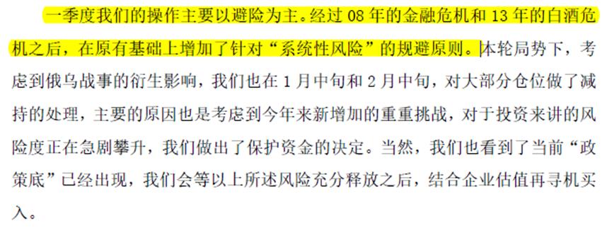 而且承认一季度的操作主要以避险为主,经过08年的金融危机和13年的白酒危机之后,在原有基础上增加了针对“系统性风险”的规避原则。
