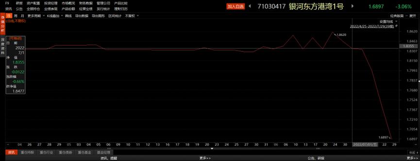 东方港湾1号最新净值(7月29日)为1.6897元,远低于“空仓”时的1.83元净值水平,相比6月底的高点1.8620元,下跌了9.25%;